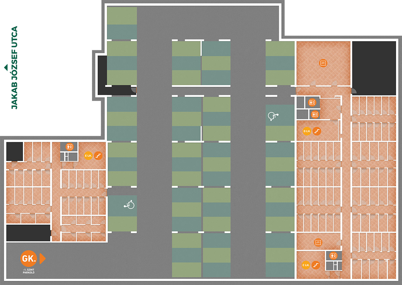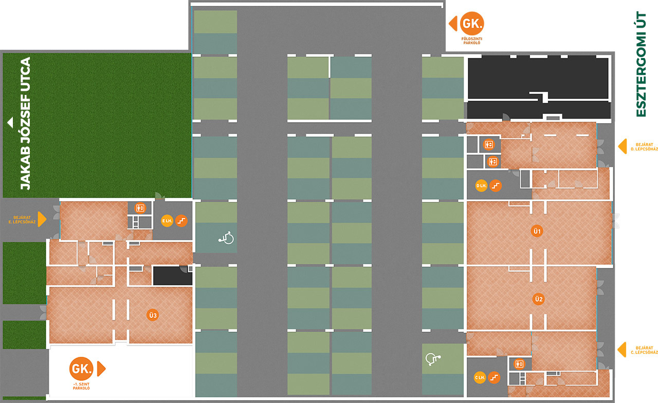 A Dagály Park I. ütemében összesen 123 db parkolóhely kerül kialakításra, melyből 64 db parkoló a pinceszinten, 59 db pedig a földszinten kerül elhelyezésre.