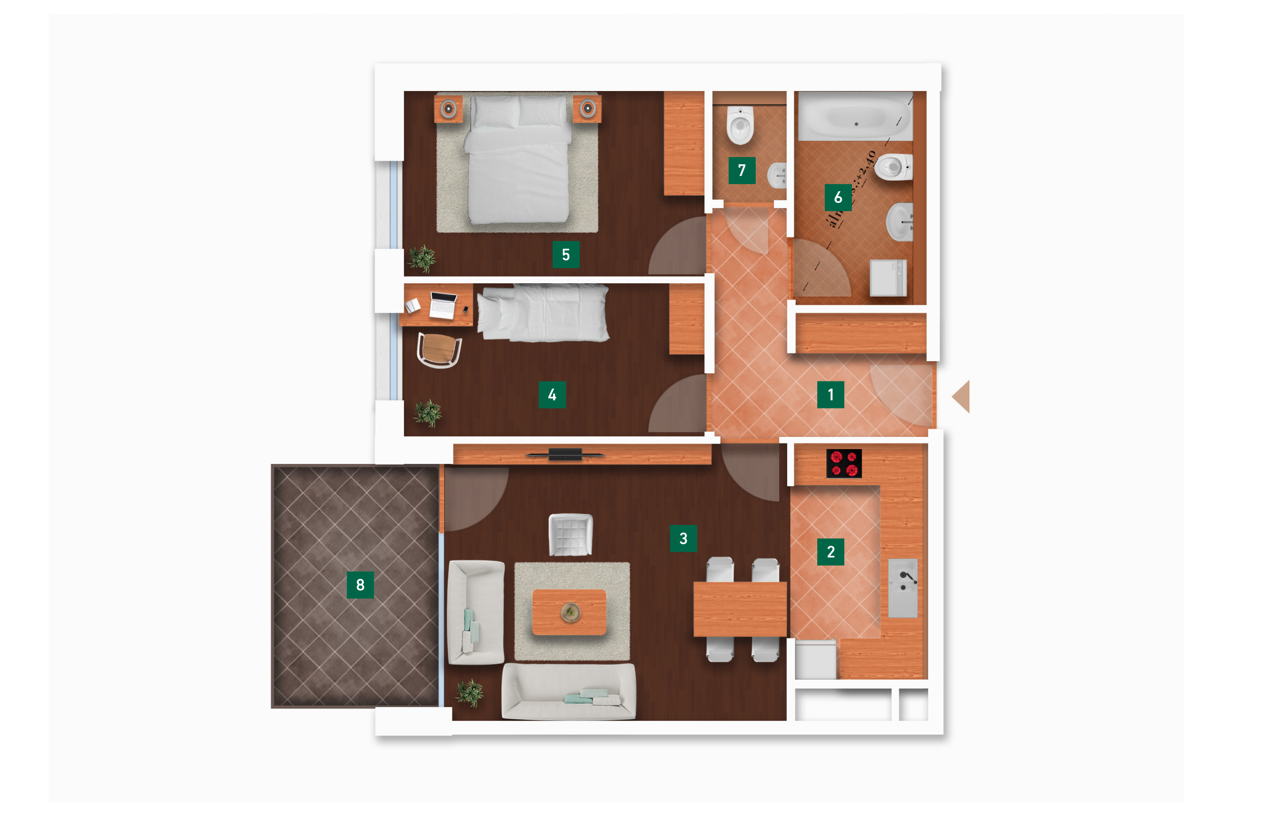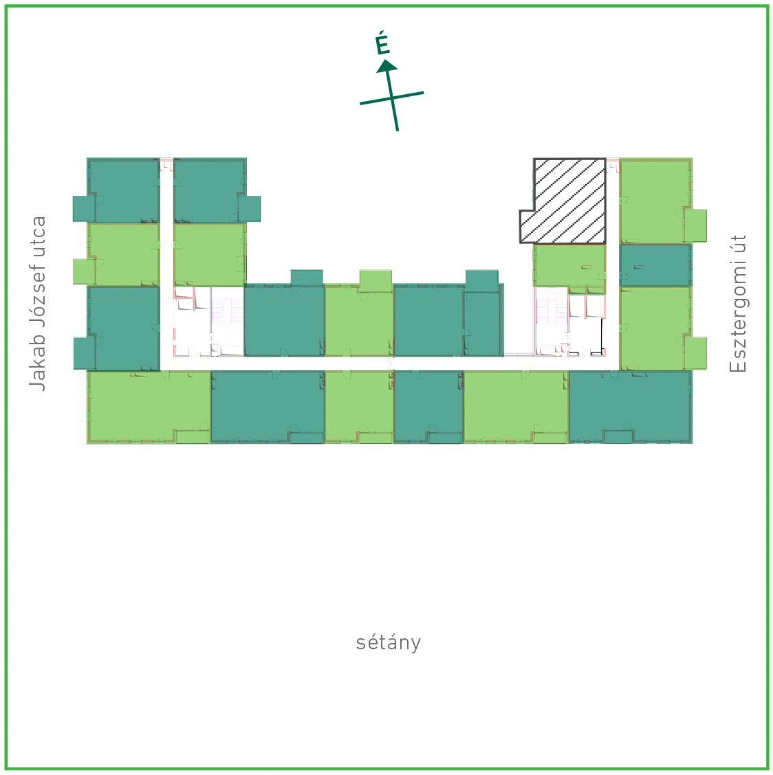 Az adatlapon megjelölt alaprajzi méretek vakolatlan falak közötti méretek, a kivitelezés során kismértékű méretváltozás lehetséges. Ezen dokumentációban közölt adatok a kiviteli tervek alapján kerültek megállapításra kizárólag tájékoztató jelleggel, nem minősülnek ajánlattételnek. Az alaprajzon feltüntetett bútorok tájékoztató jellegűek, azok rajzi elhelyezése nem feltétlenül tükrözi azok jövőbeni elhelyezhetőségét, illetve azok nem képzik a lakás részét.
