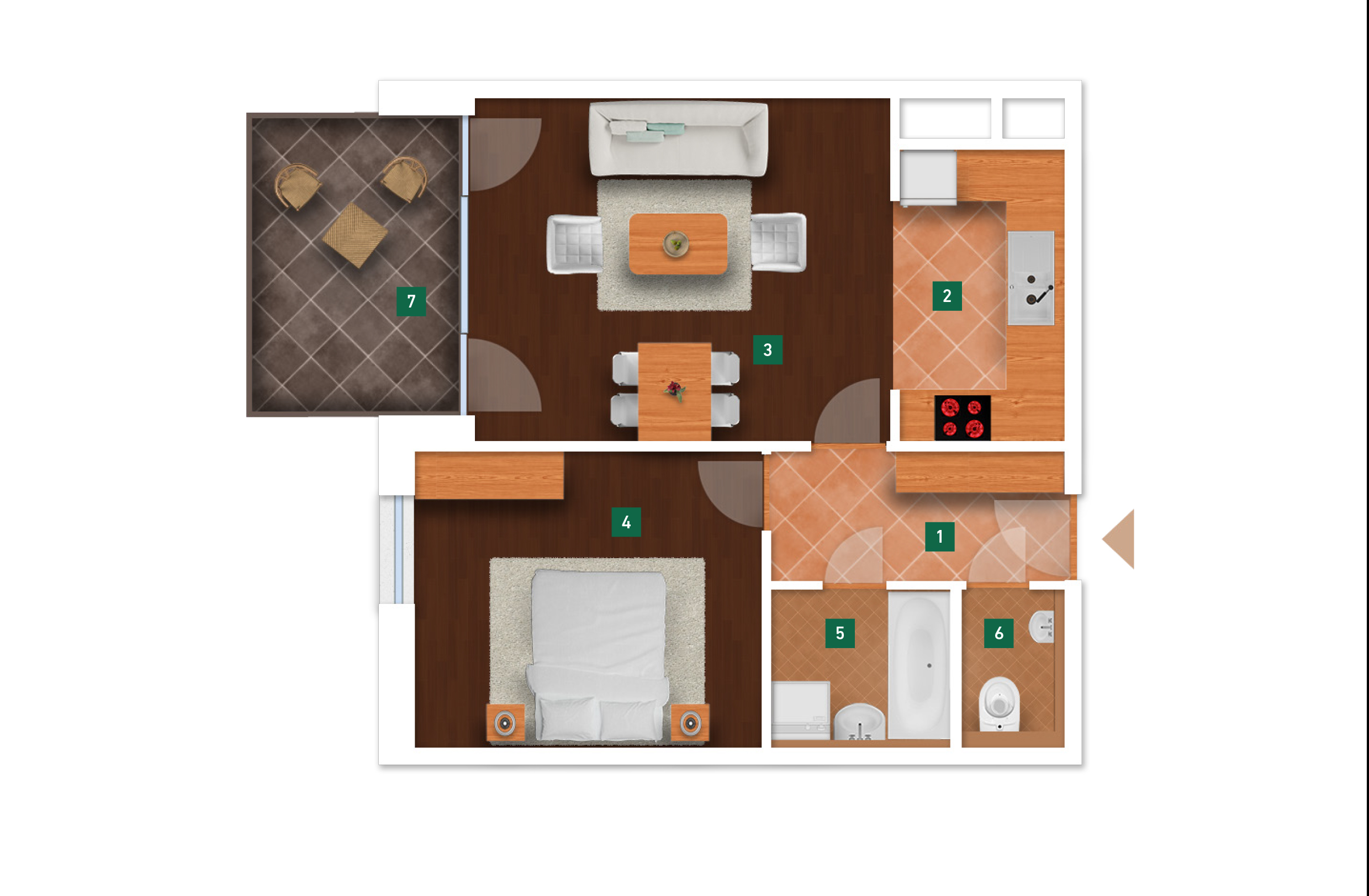 Az adatlapon megjelölt alaprajzi méretek vakolatlan falak közötti méretek, a kivitelezés során kismértékű méretváltozás lehetséges. Ezen dokumentációban közölt adatok a kiviteli tervek alapján kerültek megállapításra kizárólag tájékoztató jelleggel, nem minősülnek ajánlattételnek. Az alaprajzon feltüntetett bútorok tájékoztató jellegűek, azok rajzi elhelyezése nem feltétlenül tükrözi azok jövőbeni elhelyezhetőségét, illetve azok nem képzik a lakás részét.