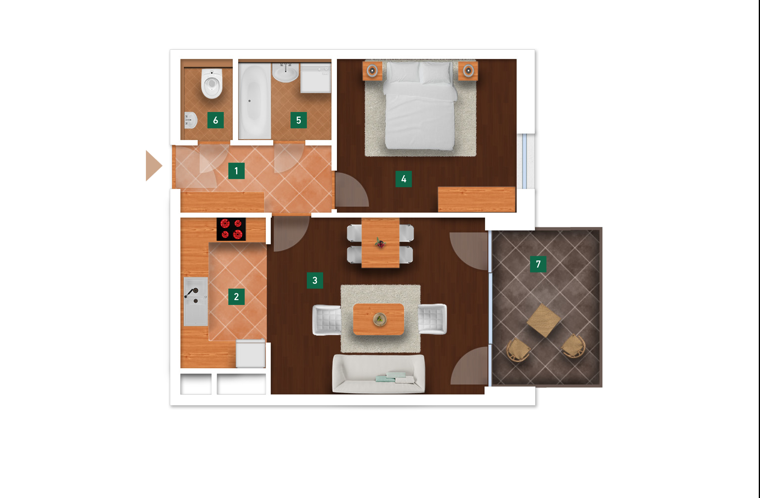 Az adatlapon megjelölt alaprajzi méretek vakolatlan falak közötti méretek, a kivitelezés során kismértékű méretváltozás lehetséges. Ezen dokumentációban közölt adatok a kiviteli tervek alapján kerültek megállapításra kizárólag tájékoztató jelleggel, nem minősülnek ajánlattételnek. Az alaprajzon feltüntetett bútorok tájékoztató jellegűek, azok rajzi elhelyezése nem feltétlenül tükrözi azok jövőbeni elhelyezhetőségét, illetve azok nem képzik a lakás részét.