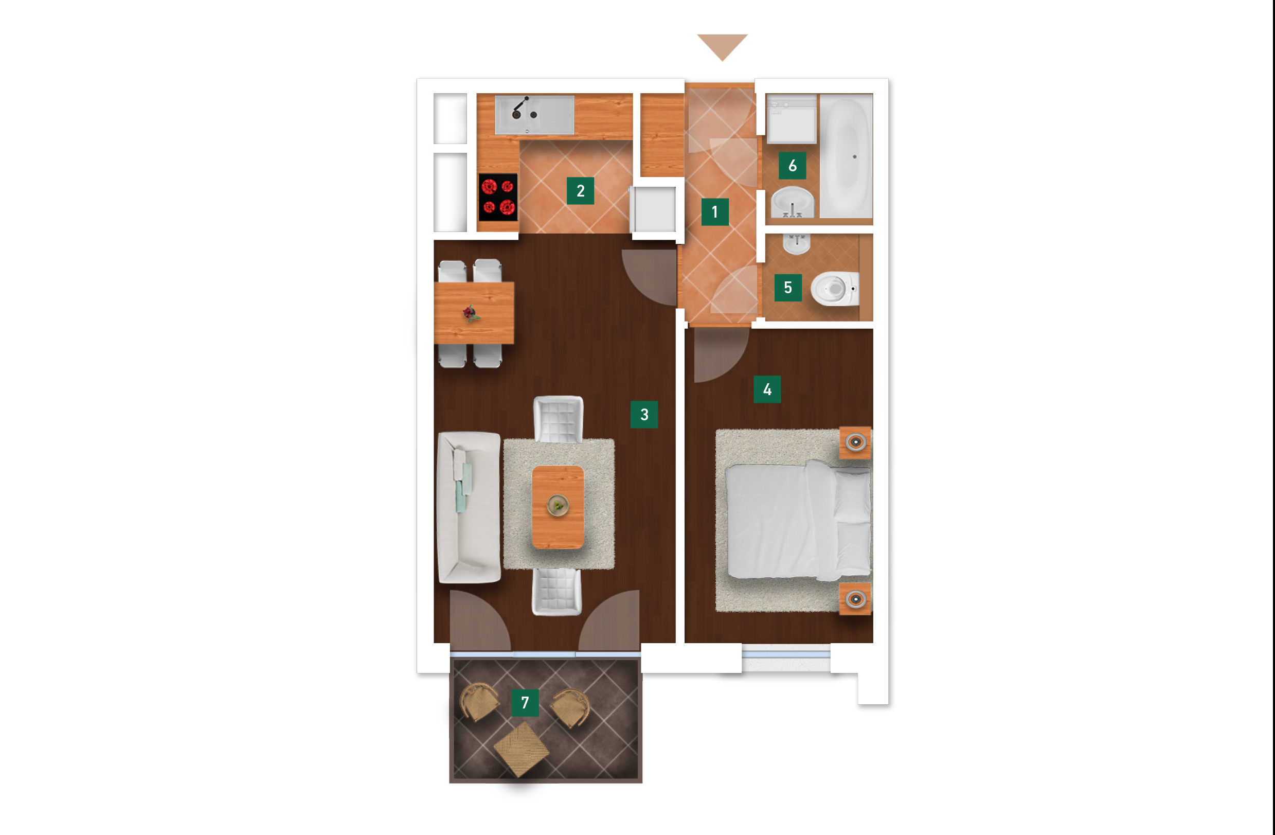 Az adatlapon megjelölt alaprajzi méretek vakolatlan falak közötti méretek, a kivitelezés során kismértékű méretváltozás lehetséges. Ezen dokumentációban közölt adatok a kiviteli tervek alapján kerültek megállapításra kizárólag tájékoztató jelleggel, nem minősülnek ajánlattételnek. Az alaprajzon feltüntetett bútorok tájékoztató jellegűek, azok rajzi elhelyezése nem feltétlenül tükrözi azok jövőbeni elhelyezhetőségét, illetve azok nem képzik a lakás részét.