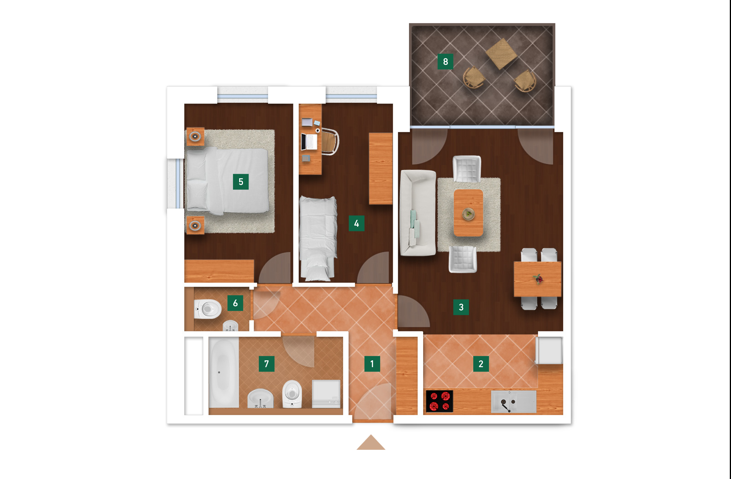 Az adatlapon megjelölt alaprajzi méretek vakolatlan falak közötti méretek, a kivitelezés során kismértékű méretváltozás lehetséges. Ezen dokumentációban közölt adatok a kiviteli tervek alapján kerültek megállapításra kizárólag tájékoztató jelleggel, nem minősülnek ajánlattételnek. Az alaprajzon feltüntetett bútorok tájékoztató jellegűek, azok rajzi elhelyezése nem feltétlenül tükrözi azok jövőbeni elhelyezhetőségét, illetve azok nem képzik a lakás részét.