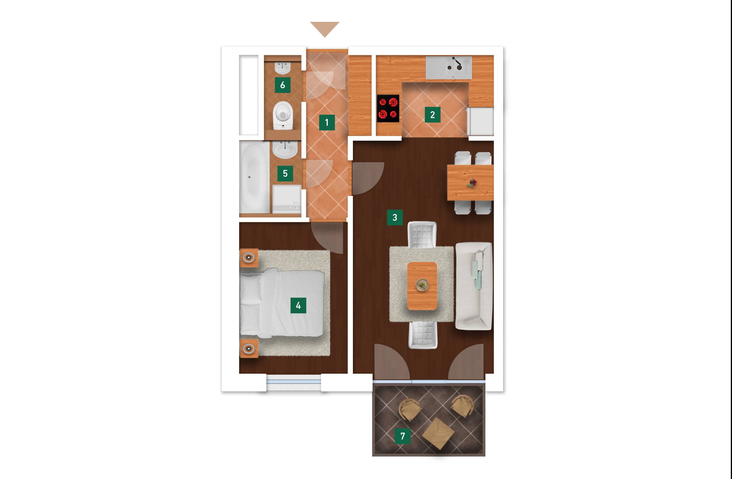 Az adatlapon megjelölt alaprajzi méretek vakolatlan falak közötti méretek, a kivitelezés során kismértékű méretváltozás lehetséges. Ezen dokumentációban közölt adatok a kiviteli tervek alapján kerültek megállapításra kizárólag tájékoztató jelleggel, nem minősülnek ajánlattételnek. Az alaprajzon feltüntetett bútorok tájékoztató jellegűek, azok rajzi elhelyezése nem feltétlenül tükrözi azok jövőbeni elhelyezhetőségét, illetve azok nem képzik a lakás részét.