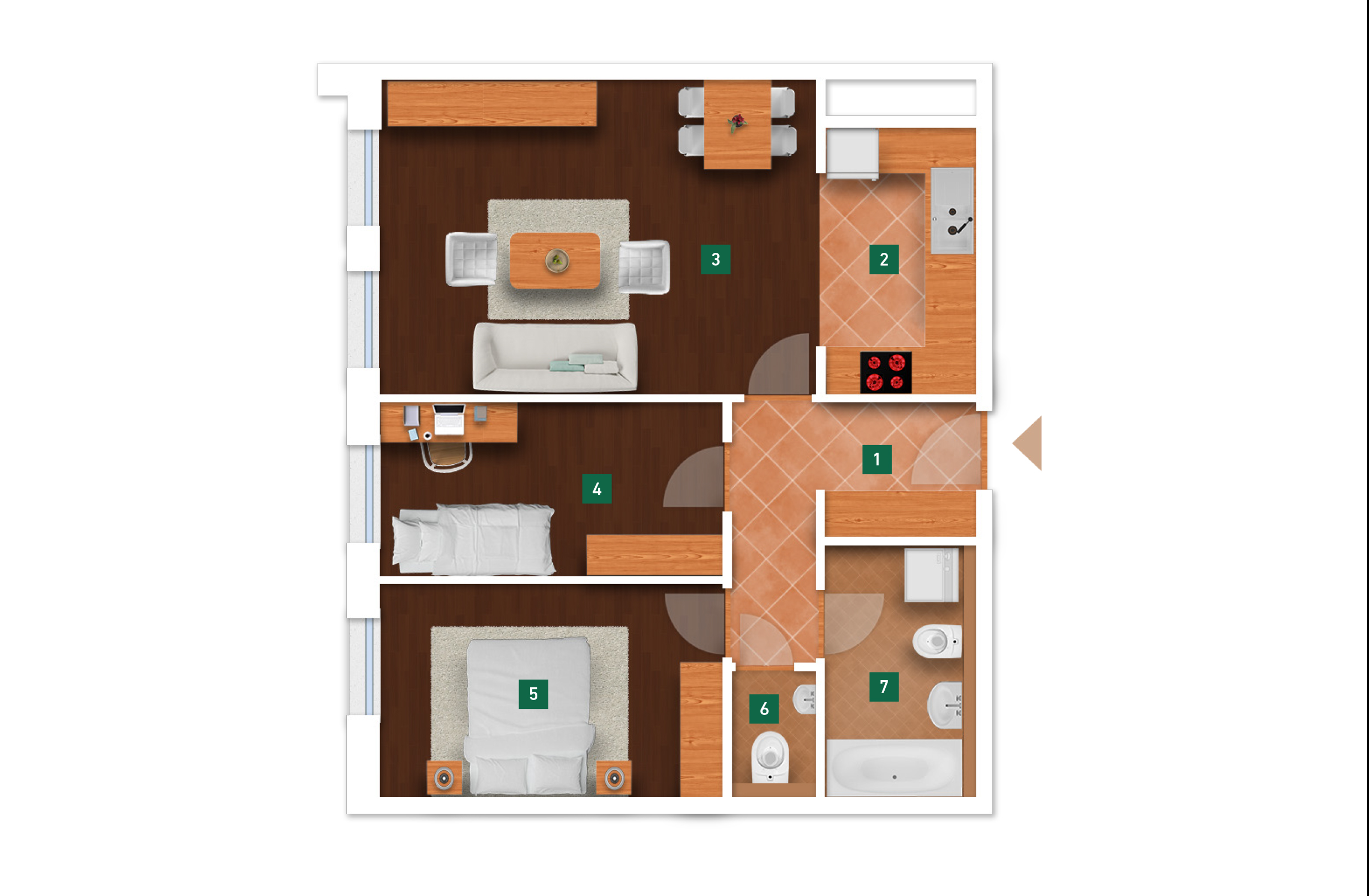 Az adatlapon megjelölt alaprajzi méretek vakolatlan falak közötti méretek, a kivitelezés során kismértékű méretváltozás lehetséges. Ezen dokumentációban közölt adatok a kiviteli tervek alapján kerültek megállapításra kizárólag tájékoztató jelleggel, nem minősülnek ajánlattételnek. Az alaprajzon feltüntetett bútorok tájékoztató jellegűek, azok rajzi elhelyezése nem feltétlenül tükrözi azok jövőbeni elhelyezhetőségét, illetve azok nem képzik a lakás részét.