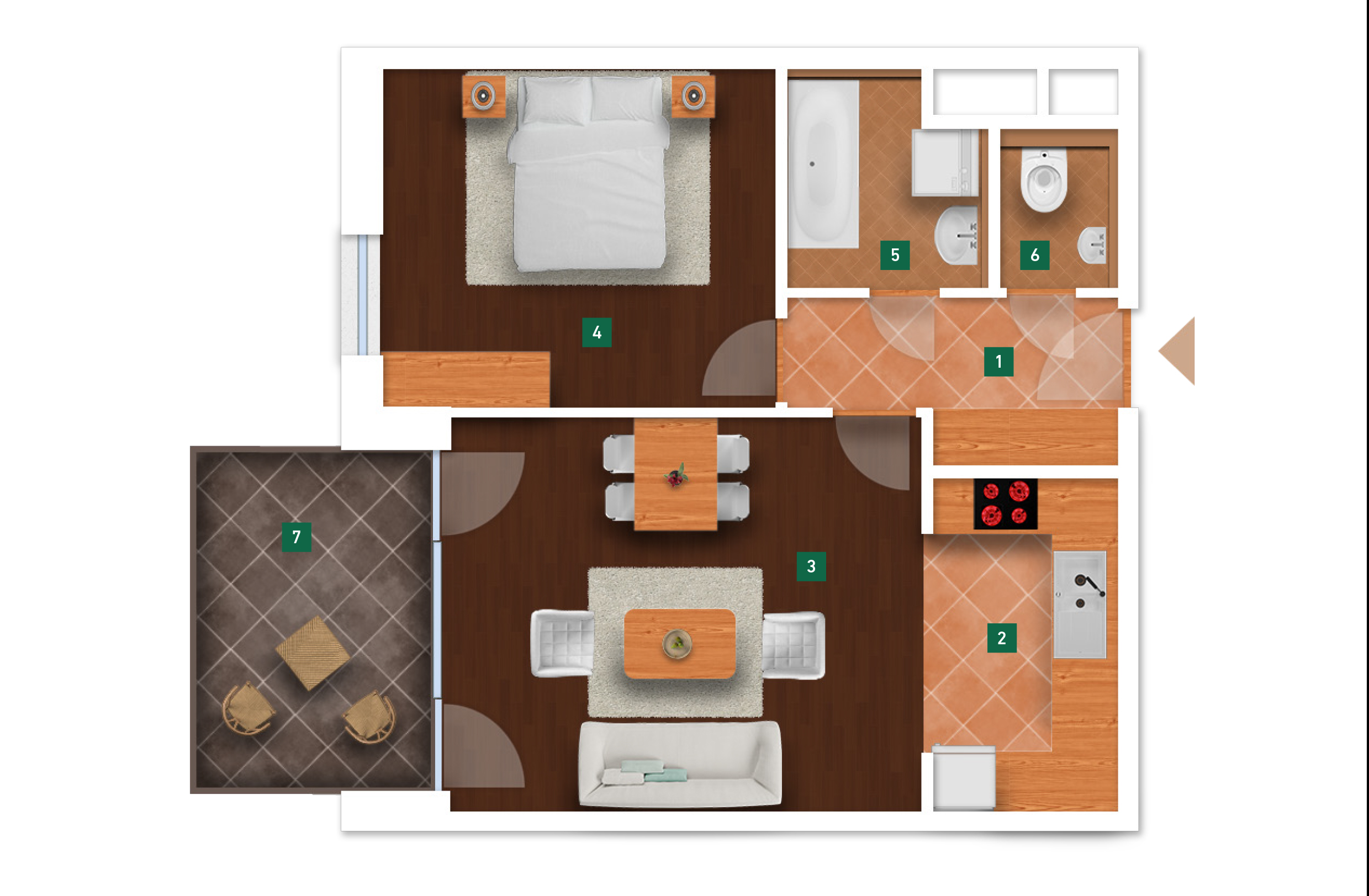 Az adatlapon megjelölt alaprajzi méretek vakolatlan falak közötti méretek, a kivitelezés során kismértékű méretváltozás lehetséges. Ezen dokumentációban közölt adatok a kiviteli tervek alapján kerültek megállapításra kizárólag tájékoztató jelleggel, nem minősülnek ajánlattételnek. Az alaprajzon feltüntetett bútorok tájékoztató jellegűek, azok rajzi elhelyezése nem feltétlenül tükrözi azok jövőbeni elhelyezhetőségét, illetve azok nem képzik a lakás részét.