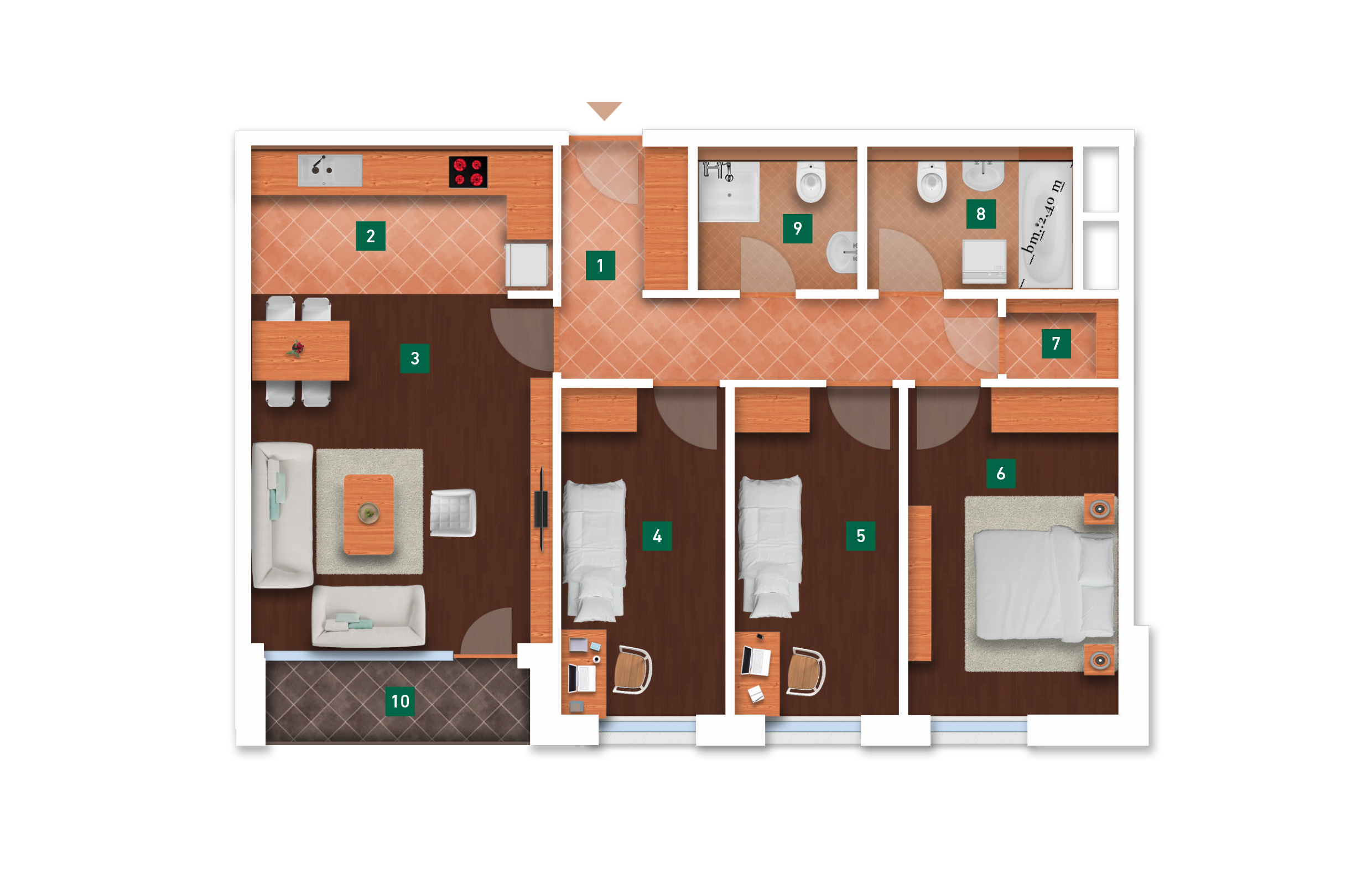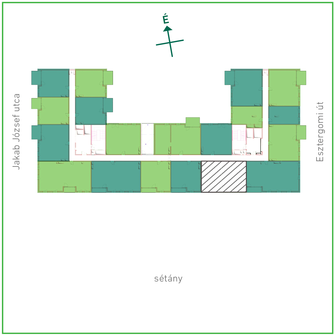 Az adatlapon megjelölt alaprajzi méretek vakolatlan falak közötti méretek, a kivitelezés során kismértékű méretváltozás lehetséges. Ezen dokumentációban közölt adatok a kiviteli tervek alapján kerültek megállapításra kizárólag tájékoztató jelleggel, nem minősülnek ajánlattételnek. Az alaprajzon feltüntetett bútorok tájékoztató jellegűek, azok rajzi elhelyezése nem feltétlenül tükrözi azok jövőbeni elhelyezhetőségét, illetve azok nem képzik a lakás részét.