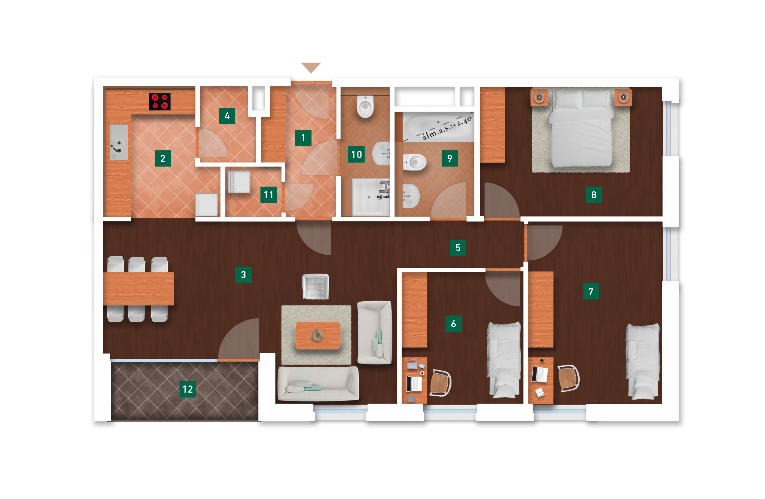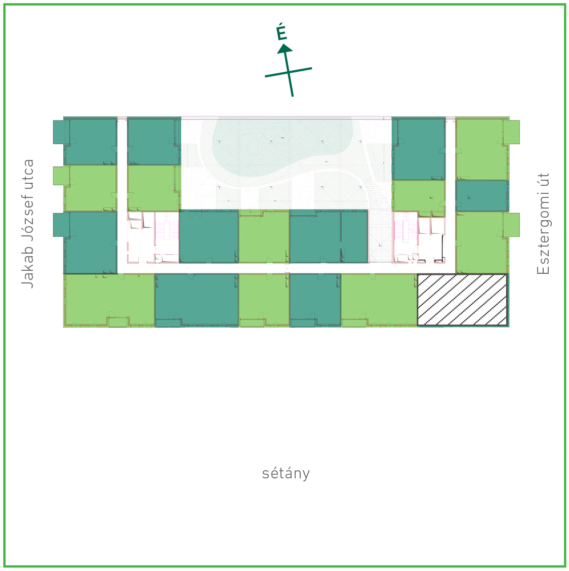 Az adatlapon megjelölt alaprajzi méretek vakolatlan falak közötti méretek, a kivitelezés során kismértékű méretváltozás lehetséges. Ezen dokumentációban közölt adatok a kiviteli tervek alapján kerültek megállapításra kizárólag tájékoztató jelleggel, nem minősülnek ajánlattételnek. Az alaprajzon feltüntetett bútorok tájékoztató jellegűek, azok rajzi elhelyezése nem feltétlenül tükrözi azok jövőbeni elhelyezhetőségét, illetve azok nem képzik a lakás részét.