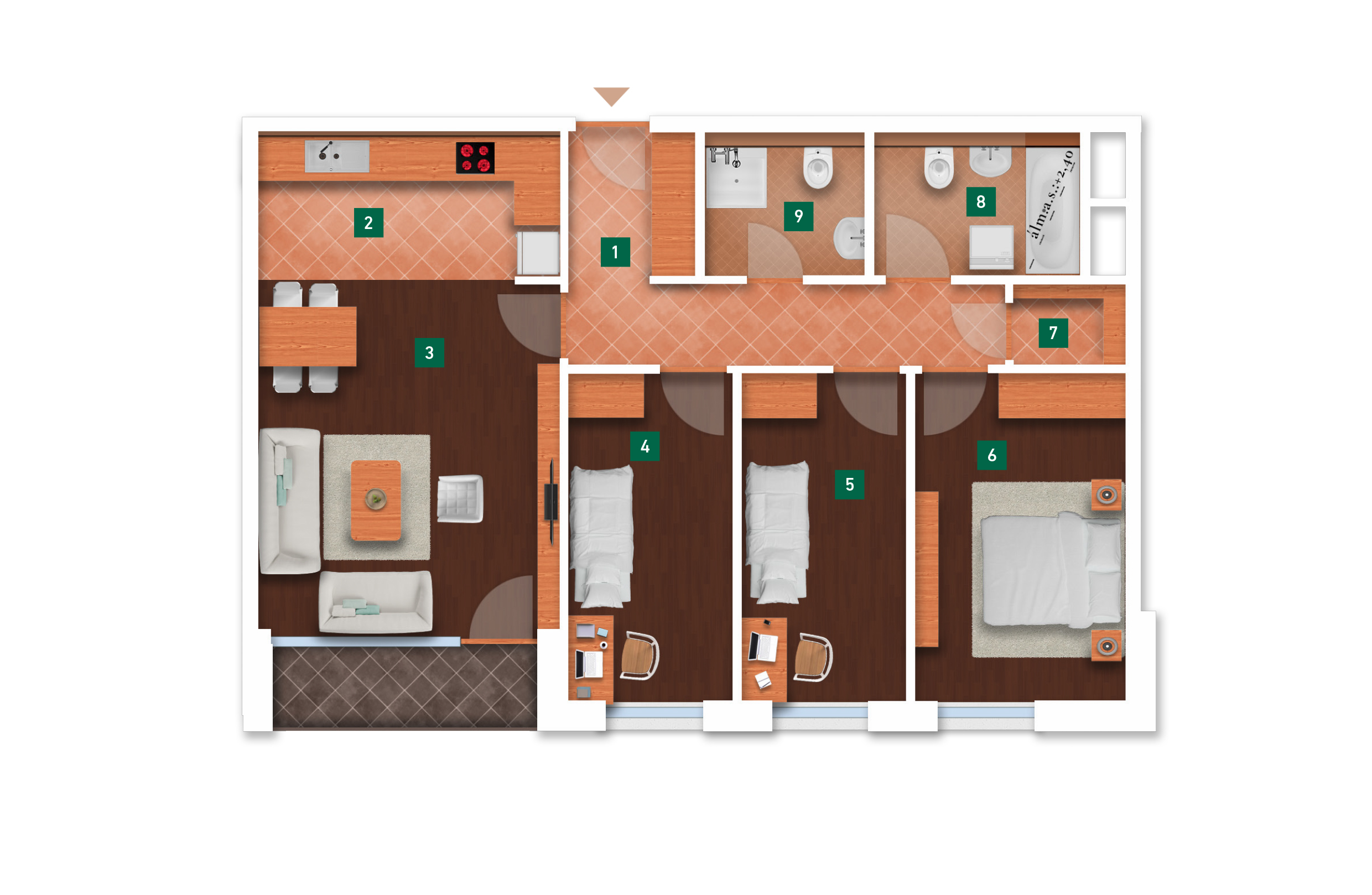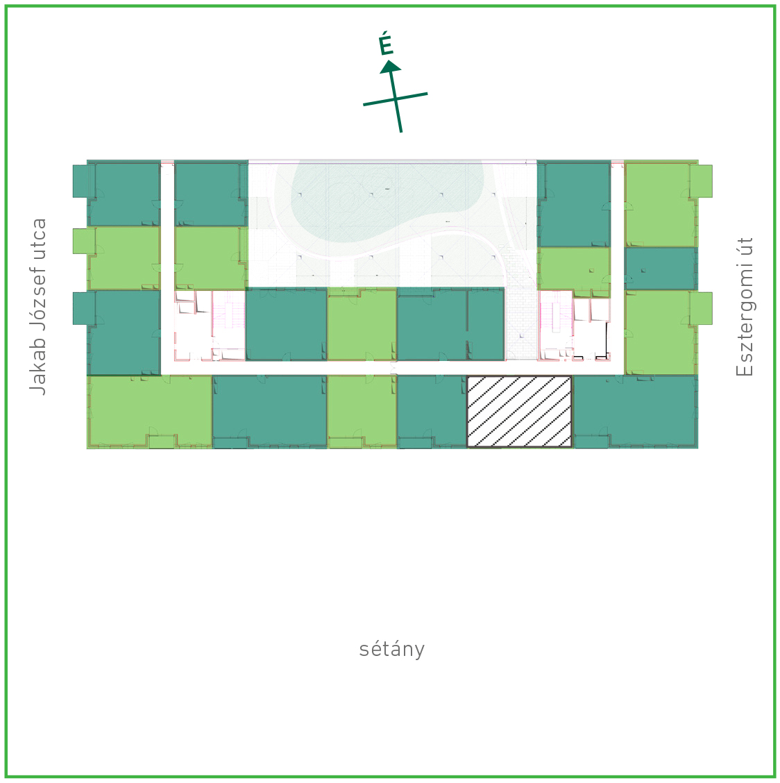 Az adatlapon megjelölt alaprajzi méretek vakolatlan falak közötti méretek, a kivitelezés során kismértékű méretváltozás lehetséges. Ezen dokumentációban közölt adatok a kiviteli tervek alapján kerültek megállapításra kizárólag tájékoztató jelleggel, nem minősülnek ajánlattételnek. Az alaprajzon feltüntetett bútorok tájékoztató jellegűek, azok rajzi elhelyezése nem feltétlenül tükrözi azok jövőbeni elhelyezhetőségét, illetve azok nem képzik a lakás részét.