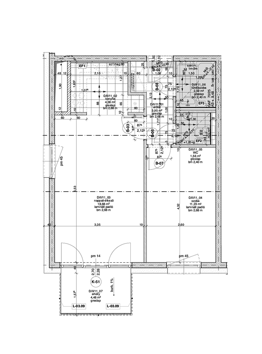 Az adatlapon megjelölt alaprajzi méretek vakolatlan falak közötti méretek, a kivitelezés során kismértékű méretváltozás lehetséges. Ezen dokumentációban közölt adatok a kiviteli tervek alapján kerültek megállapításra kizárólag tájékoztató jelleggel, nem minősülnek ajánlattételnek. Az alaprajzon feltüntetett bútorok tájékoztató jellegűek, azok rajzi elhelyezése nem feltétlenül tükrözi azok jövőbeni elhelyezhetőségét, illetve azok nem képzik a lakás részét.