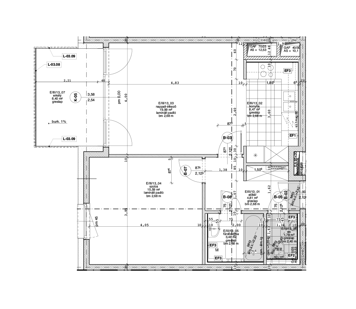 Az adatlapon megjelölt alaprajzi méretek vakolatlan falak közötti méretek, a kivitelezés során kismértékű méretváltozás lehetséges. Ezen dokumentációban közölt adatok a kiviteli tervek alapján kerültek megállapításra kizárólag tájékoztató jelleggel, nem minősülnek ajánlattételnek. Az alaprajzon feltüntetett bútorok tájékoztató jellegűek, azok rajzi elhelyezése nem feltétlenül tükrözi azok jövőbeni elhelyezhetőségét, illetve azok nem képzik a lakás részét.