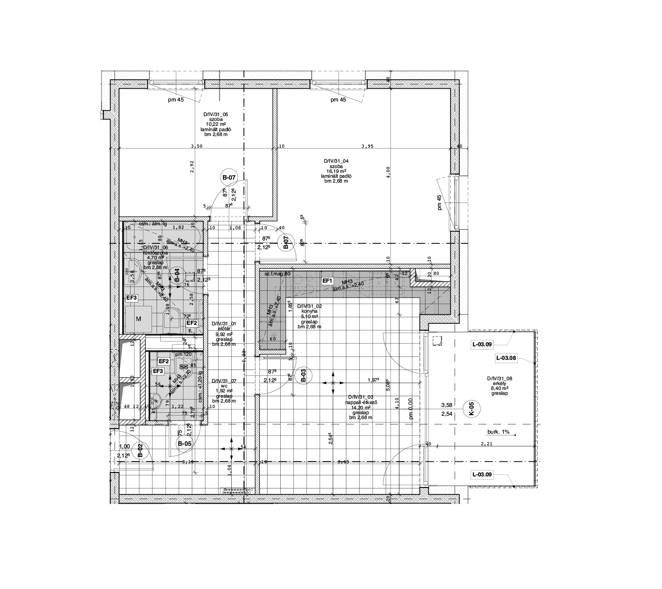 Az adatlapon megjelölt alaprajzi méretek vakolatlan falak közötti méretek, a kivitelezés során kismértékű méretváltozás lehetséges. Ezen dokumentációban közölt adatok a kiviteli tervek alapján kerültek megállapításra kizárólag tájékoztató jelleggel, nem minősülnek ajánlattételnek. Az alaprajzon feltüntetett bútorok tájékoztató jellegűek, azok rajzi elhelyezése nem feltétlenül tükrözi azok jövőbeni elhelyezhetőségét, illetve azok nem képzik a lakás részét.