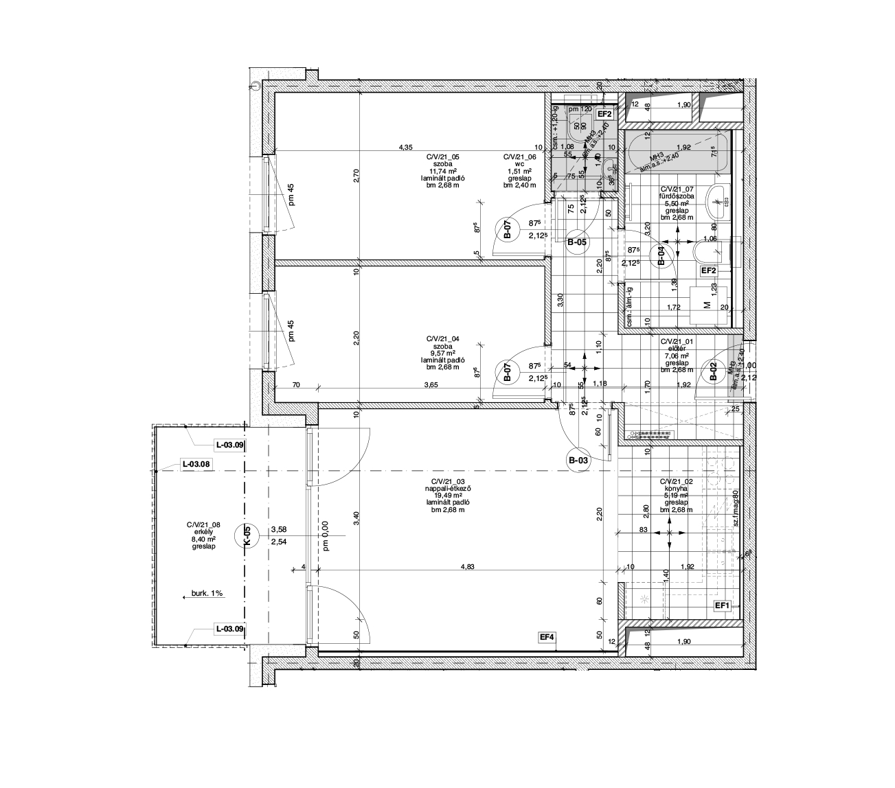 Az adatlapon megjelölt alaprajzi méretek vakolatlan falak közötti méretek, a kivitelezés során kismértékű méretváltozás lehetséges. Ezen dokumentációban közölt adatok a kiviteli tervek alapján kerültek megállapításra kizárólag tájékoztató jelleggel, nem minősülnek ajánlattételnek. Az alaprajzon feltüntetett bútorok tájékoztató jellegűek, azok rajzi elhelyezése nem feltétlenül tükrözi azok jövőbeni elhelyezhetőségét, illetve azok nem képzik a lakás részét.