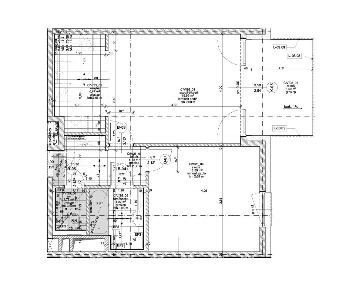 Az adatlapon megjelölt alaprajzi méretek vakolatlan falak közötti méretek, a kivitelezés során kismértékű méretváltozás lehetséges. Ezen dokumentációban közölt adatok a kiviteli tervek alapján kerültek megállapításra kizárólag tájékoztató jelleggel, nem minősülnek ajánlattételnek. Az alaprajzon feltüntetett bútorok tájékoztató jellegűek, azok rajzi elhelyezése nem feltétlenül tükrözi azok jövőbeni elhelyezhetőségét, illetve azok nem képzik a lakás részét.