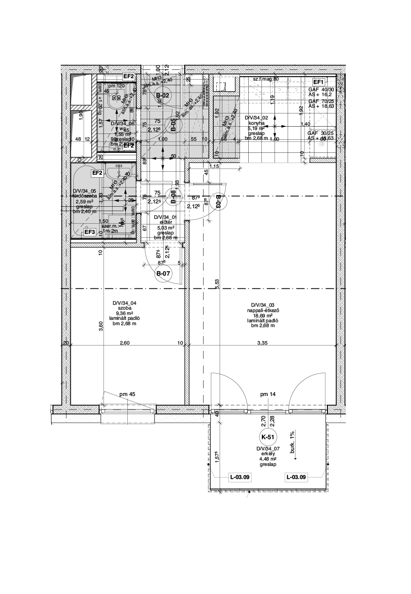 Az adatlapon megjelölt alaprajzi méretek vakolatlan falak közötti méretek, a kivitelezés során kismértékű méretváltozás lehetséges. Ezen dokumentációban közölt adatok a kiviteli tervek alapján kerültek megállapításra kizárólag tájékoztató jelleggel, nem minősülnek ajánlattételnek. Az alaprajzon feltüntetett bútorok tájékoztató jellegűek, azok rajzi elhelyezése nem feltétlenül tükrözi azok jövőbeni elhelyezhetőségét, illetve azok nem képzik a lakás részét.